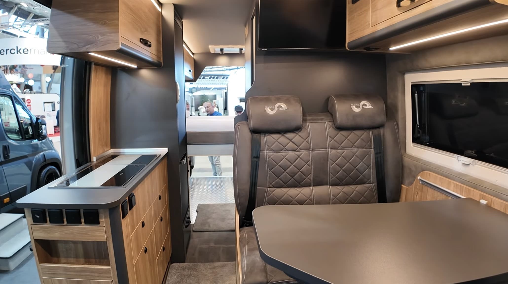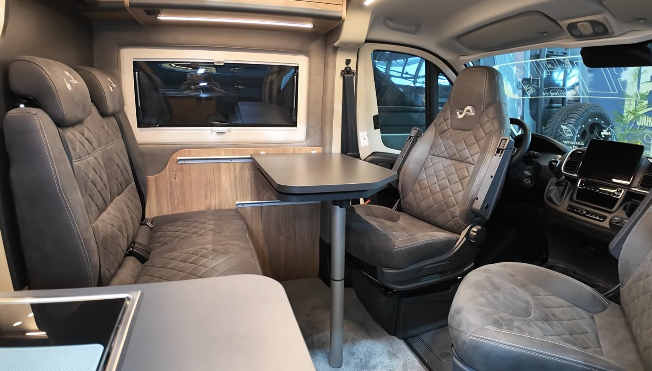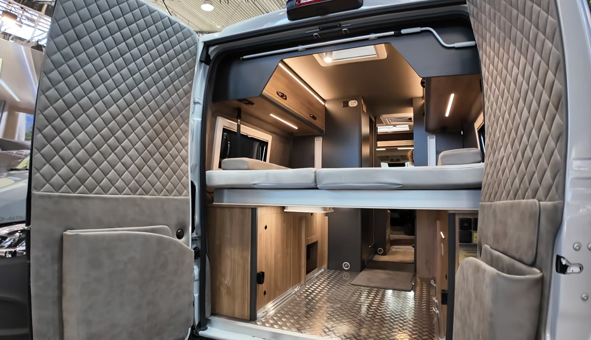 La camera da letto propone due configurazioni: letto pieghevole manuale o elettrico a scomparsa. In entrambi i casi, la zona posteriore si libera completamente per e-bike, kayak o attrezzatura varia. Il pavimento è in lamiera mandorlata. I pannelli sopra le porte sono morbidi al tatto, con cuciture a rombi. I vani portaoggetti non mancano.