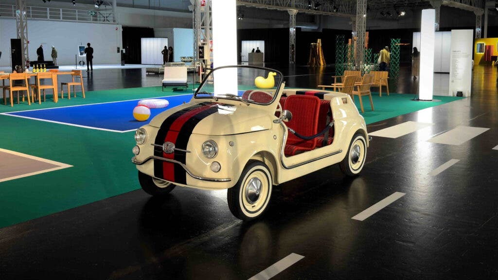 Il terzo capitolo va in scena al Superstudio Maxi, dove Garage Italia partecipa come partner tecnico a The City, mostra curata da Giulio Cappellini nell’ambito di SuperCity. La 500 Spiaggina qui si fa elettrica e visivamente più decisa: striscia rossa centrale, due bande blu su base Wimbledon White, sedute in midollino naturale firmate Bonacina e verniciate di rosso, tappetini coordinati Italdek.