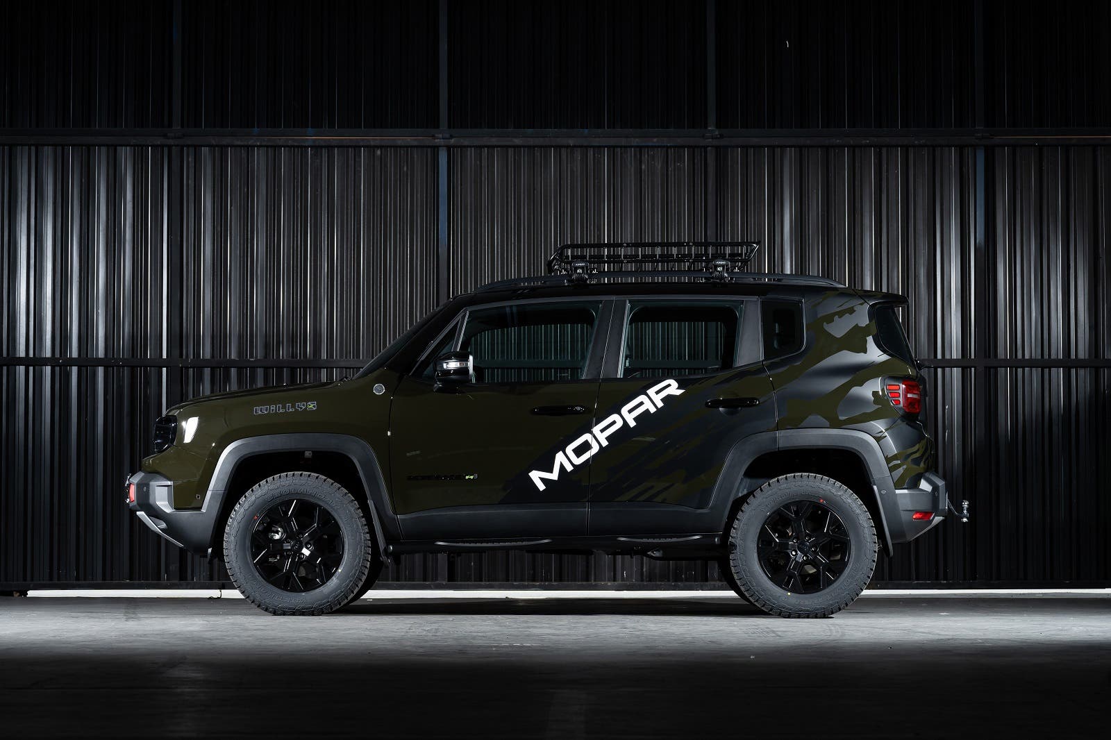 Basato sulla versione Willys del Renegade, nella colorazione Recon Green, il concept ha ricevuto una speciale pellicola con decalcomanie stilizzate nere opache e un esclusivo verricello elettrico con una fune in Kevlar da 13.500 libbre, appositamente progettata e prodotta per il modello. Il design esterno esalta ulteriormente la versatilità del modello con predellini laterali, gancio di traino integrato, portabici per due biciclette sul gancio e parafanghi Mopar per affrontare il fango, frutto dello spirito Jeep. All’interno, il nuovo abitacolo presenta tappetini con bordo rialzato e tappetino per il bagagliaio, e il logo Jeep viene proiettato all’apertura delle portiere.
