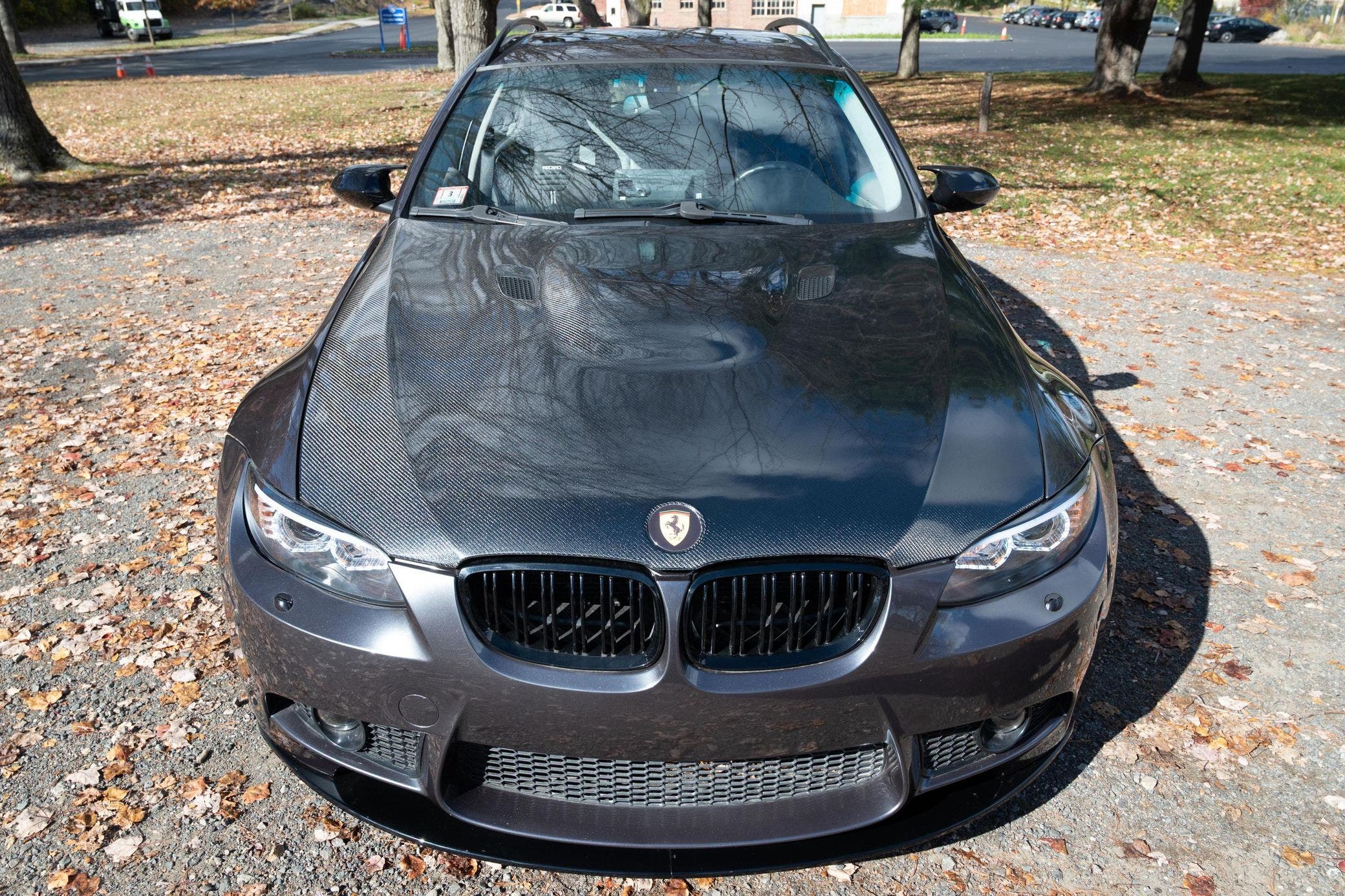 Ma le modifiche non finiscono con il trapianto meccanico. La 328xi Touring del 2007 di cui parliamo ha dovuto eliminare la trazione integrale per far posto al V8 e ora è trazione posteriore. Per qualcuno sarebbe quella M3 Touring che BMW all’epoca si rifiutava di costruire. Vanta anche un body kit impressionante: paraurti anteriore, parafanghi M con prese d’aria, minigonne laterali e specchietti esterni sono stati presi in prestito dalla vera M3. Il tocco finale è il cofano in fibra di carbonio con (addirittura) lo stemma Ferrari e i cerchi Volk TE37SL da 19 pollici.