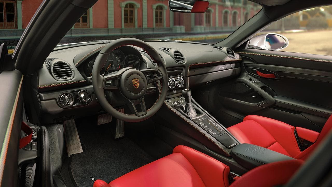 All’interno, l’abitacolo è caratterizzato da sedili sportivi e volante rivestiti in pelle rossa, che creano un interessante contrasto con il cruscotto e il tunnel centrale in nero. Un dettaglio esclusivo è il supporto speciale inserito nel bracciolo centrale, pensato per custodire uno speciale orologio realizzato in collaborazione con TAG Heuer.