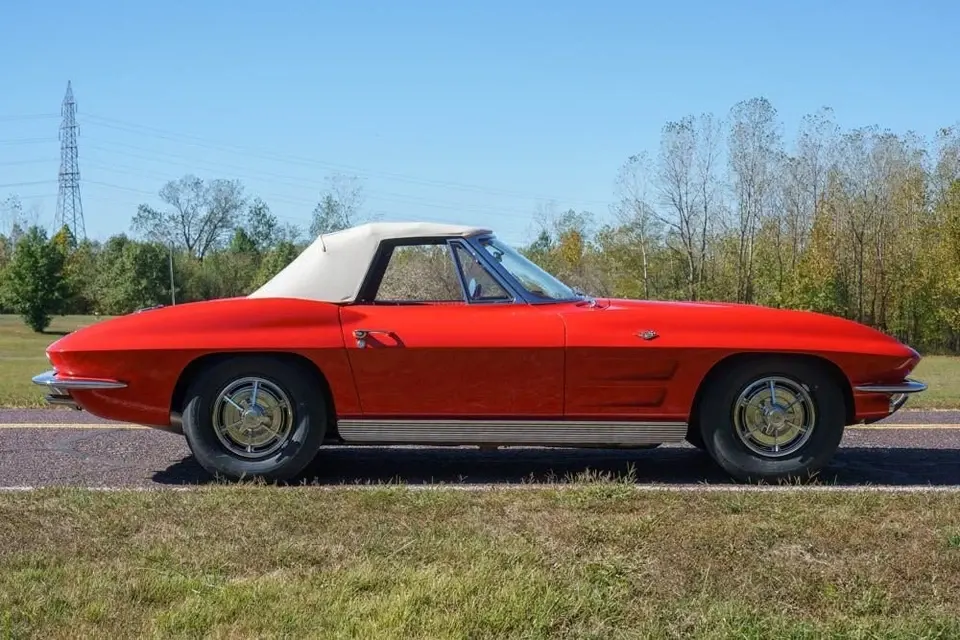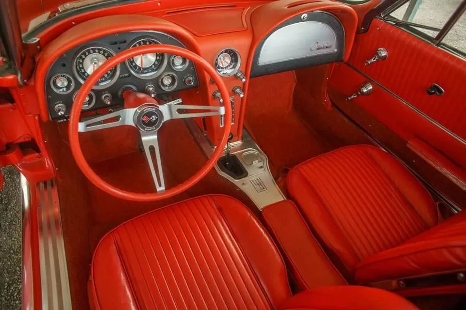 Sotto il cofano, i numeri corrispondono, e l’auto monta il motore base 327 da 250 CV, abbinato a un cambio manuale Muncie a quattro marce e al carburatore a quattro corpi. Nel 1963 erano disponibili altri tre upgrade: il 327 L75 da 300 CV, l’L76 da 340 CV e l’esotico L84, che utilizzava l’iniezione Ram-Jet per raggiungere i 360 CV.