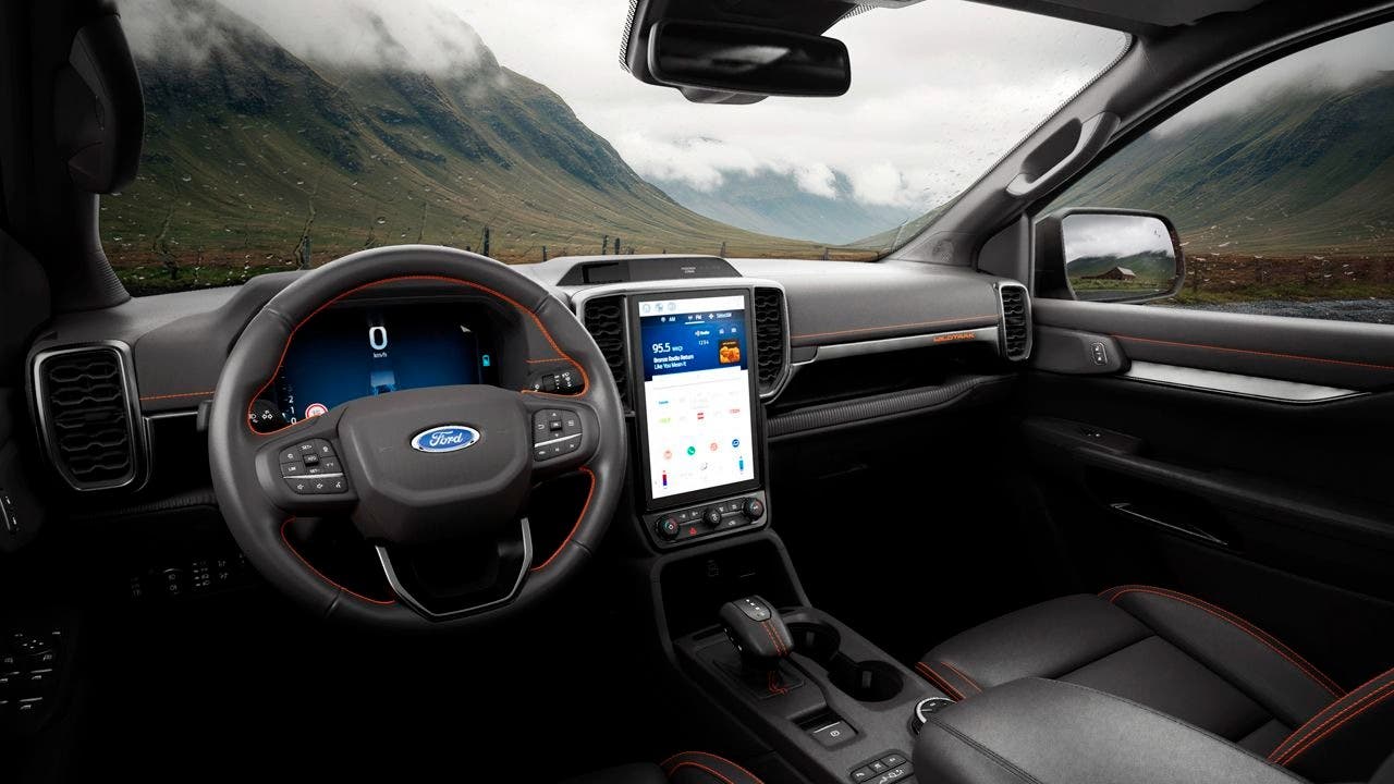 Inside the cabin, perceived quality takes a clear step forward. New glossy black inserts appear on the steering wheel, door panels, dashboard and air vents, combined with contrasting gray stitching. The seats are upholstered in black leather with quilting that echoes the bodywork design. The Wildtrak gains additional customization with engraved logos on the seats and double orange decorative stitching.