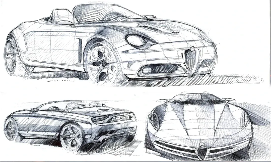 Diaz was working on them at night, like some underground apostle of beautiful cars, even pushing the concept toward a 1:1 scale model on the legendary Alfa Romeo 8C Competizione platform. What did we actually get? A Fiat 124 Spider, basically a Mazda in Italian clothing, with the Biscione quietly redirected toward the more responsible, less thrilling altar of Giulia and Stelvio.