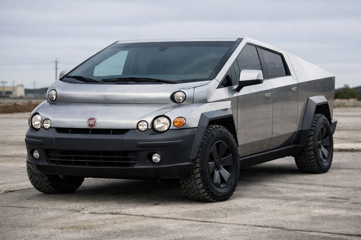 This digital experiment replaces the Cybertruck’s minimalist, flat front and horizontal LED strip with the unmistakable “bulging” headlights of the Italian cult classic. The AI swapped the cold, stainless steel bumper for the iconic, chunky black plastic of the Multipla, complete with a Fiat logo front and center. Ironically, the result possesses far more personality than the “made in USA” version, which often looks like a low-resolution video game asset that failed to load properly.