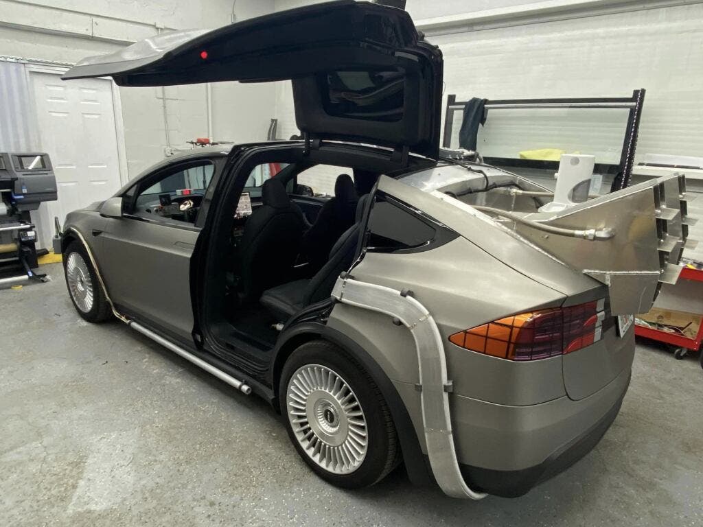 Then there’s the wilder side of the spectrum. A Model 3 built to tackle the Mojave Road, complete with a tubular steel bumper, all-terrain tires, skid plates, a 5.4-ton winch, and a rooftop tent. Or a Model X transformed into a rolling Back to the Future tribute, DeLorean cues and all, with a rear-mounted flamethrower.