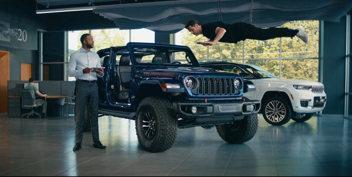 The spot features a couple intent on purchasing a 2025 Jeep Wrangler Rubicon X in Fathom Blue. During the salesperson’s presentation, the two are suddenly lifted into the air with cables above the vehicle, in a clear reference to the famous scene from the first Mission: Impossible with Tom Cruise. Making the video even more dynamic are breathtaking sequences taken directly from the new chapter of the saga.