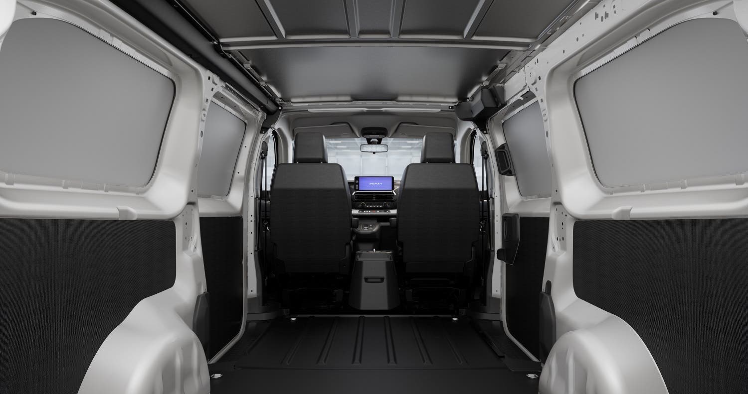 Its front-wheel-drive unibody structure allows for a wide, low, and completely flat cargo floor, with a capacity exceeding 4.7 cubic meters (about 166 cubic feet) and a usable cargo length of more than 2.7 meters (around 106 inches). The cargo area can accommodate construction materials such as drywall panels, 4×8-foot plywood sheets, and framing lumber. The rear load floor sits just over 23 inches from the ground, making loading and unloading easier. The distance between the rear wheel wells exceeds 48 inches, enough to fit a standard American pallet. The squared upper body shape also maintains nearly constant usable space from floor to roof, with more than 64 inches of overall width, allowing shelving, tool modules, or work benches to take advantage of the cargo area’s corners.