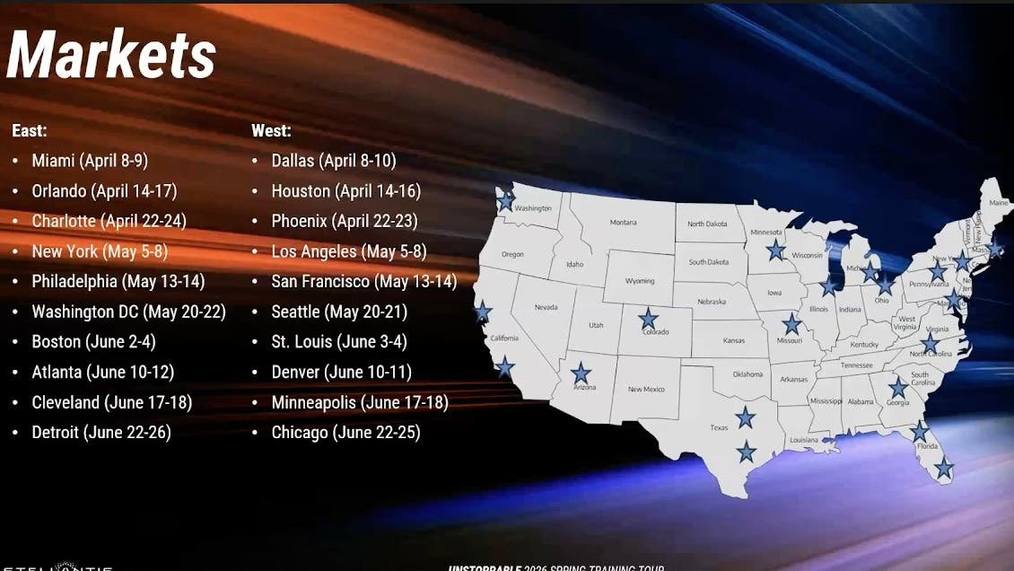 Stellantis has launched its “Unstoppable 2026 Spring Training Tour” across the United States, a traveling dealer training program that will visit 20 markets between April and late June, from Miami to Los Angeles through New York, Detroit, Dallas, and Chicago. Each stop can accommodate roughly 300 dealership employees per day, with an overall target exceeding 14,000 sales and service staff, a scale the group had not reached on North American soil in years.