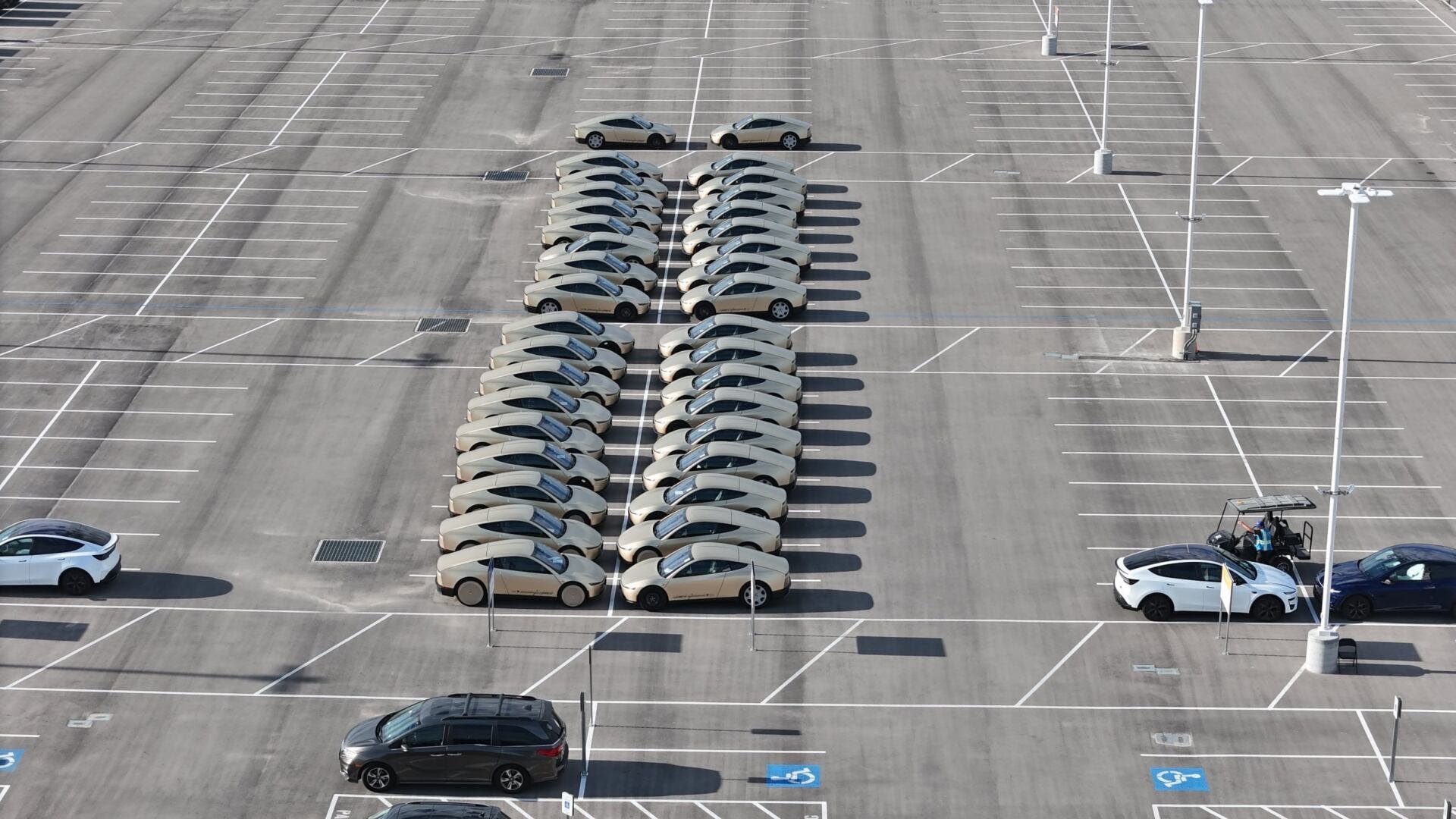 Fifty Tesla Cybercabs are parked in neat, compact rows at Giga Texas, and a drone caught every single one of them. Joe Tegtmeyer, who has spent more time hovering over the Austin campus than most people spend commuting, captured the footage that shows the robotaxi fleet quietly accumulating in the factory’s loading and unloading area.