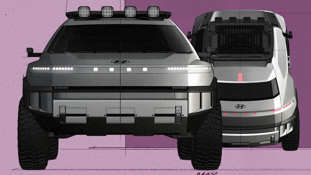 Billed as an “extreme off-road show vehicle”, the Crater is a strikingly boxy SUV that looks ready to take on the world, or at least the lonely parts of California, since it was conceived at Hyundai’s America Technical Center in Irvine. The sketches reveal a vehicle designed for serious business, sporting beefy off-road tires, dramatically increased ground clearance, and an essential set of roof-mounted auxiliary lights.