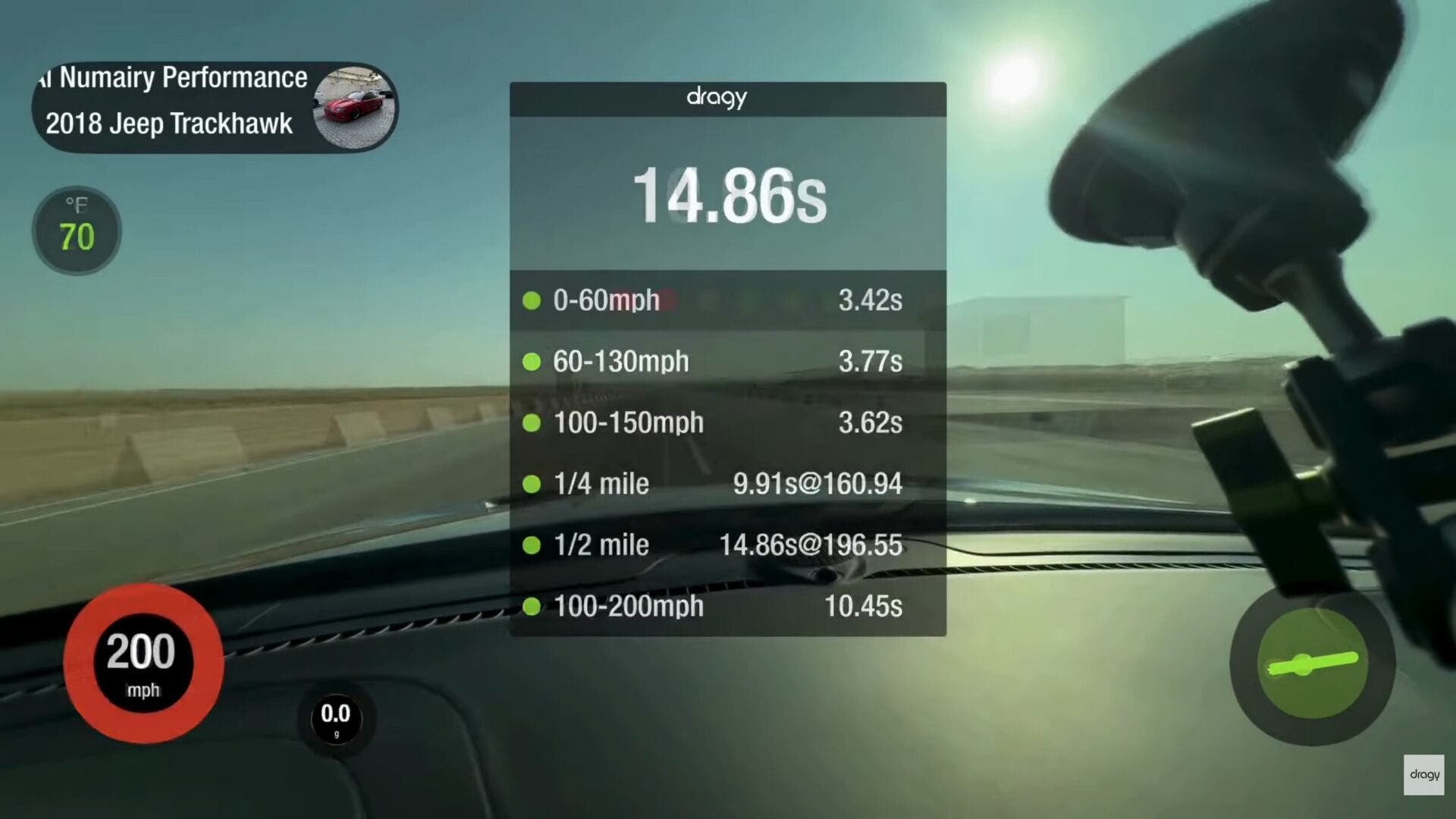 On the drag strip, the numbers are equally terrifying. This Trackhawk obliterated the quarter mile in 9.91 seconds at 161 mph. It didn’t stop there, either. It crossed the half-mile mark in 14.86 seconds, hitting a top speed of 196.5 mph. The final stat? A 100-200 mph pull in 10.45 seconds. If you’re on the highway, this Jeep will leave almost anything else on the planet wondering where their dignity went.